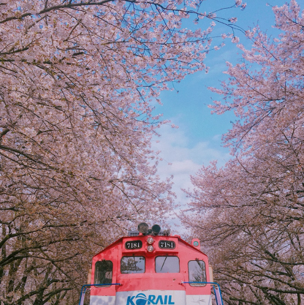 벚꽃 터널을 지나던 열차는 더 이상 달리지 않고 멈춰 서 있지만 인생사진을 위해