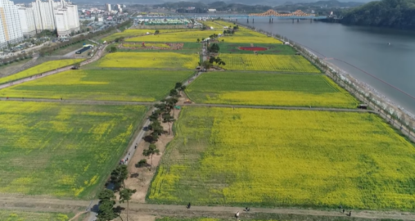 강폭이 엄청나게 넓은 낙동강을 따라 나란히 유채밭이 조성되었습니다.