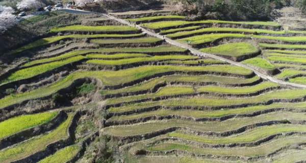 계단식 논에 유채가 만발한 장면이 눈에 들어오면 잠시 내려서 인생사진을 담기 더없이 좋은 곳으로